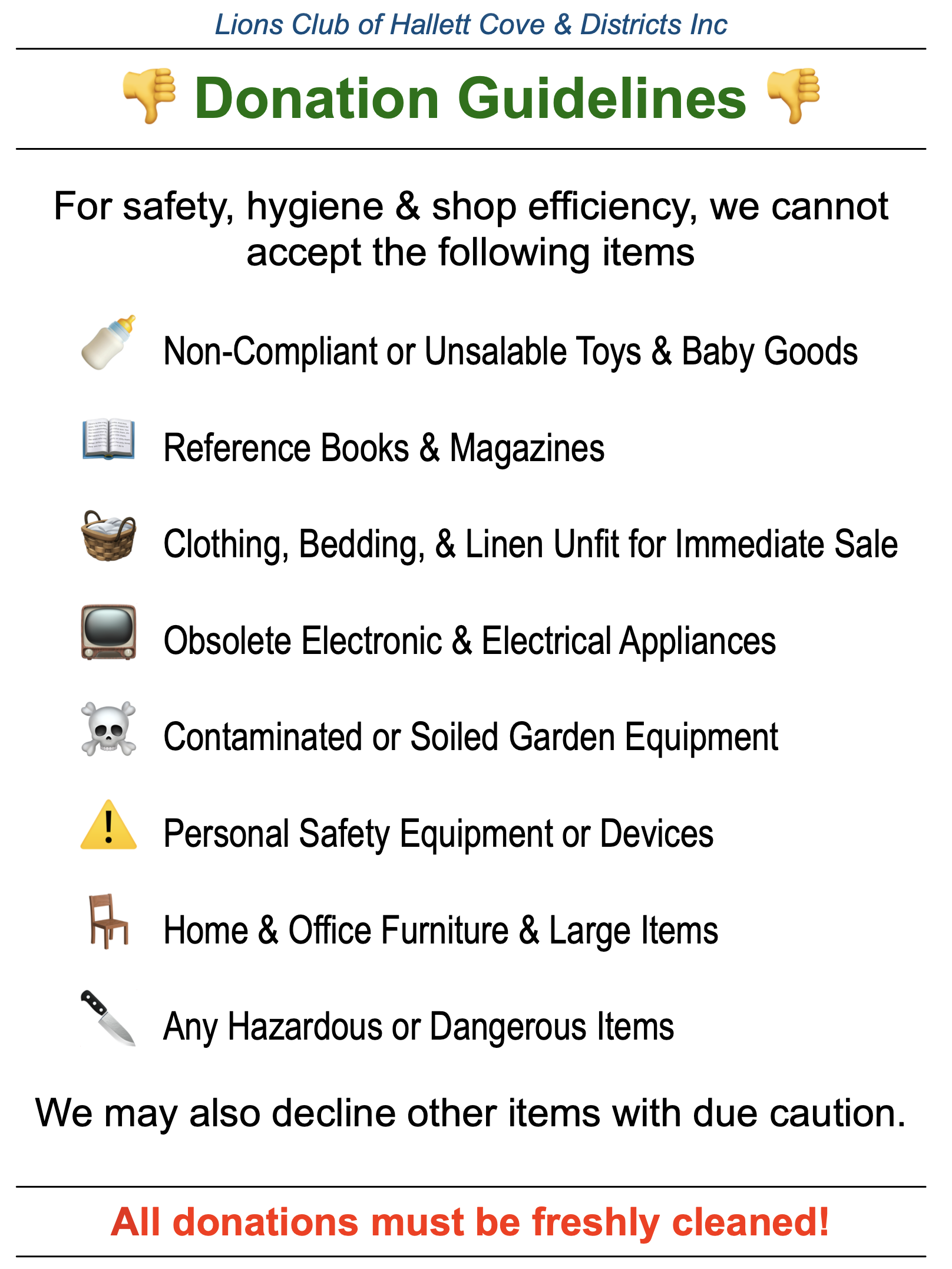 We greatly appreciate the generosity of our community. However, we cannot accept items that take up too much space, require compliance beyond our means, are illegal to resell, or need cleaning or refurbishment. Please ensure all donations are freshly cleaned, immediately saleable, and meet our requirements. A simple guide: “Would I buy this as it is?” Thank you for your support. If you want to download a list of the items that we cant accept, please click on the image.